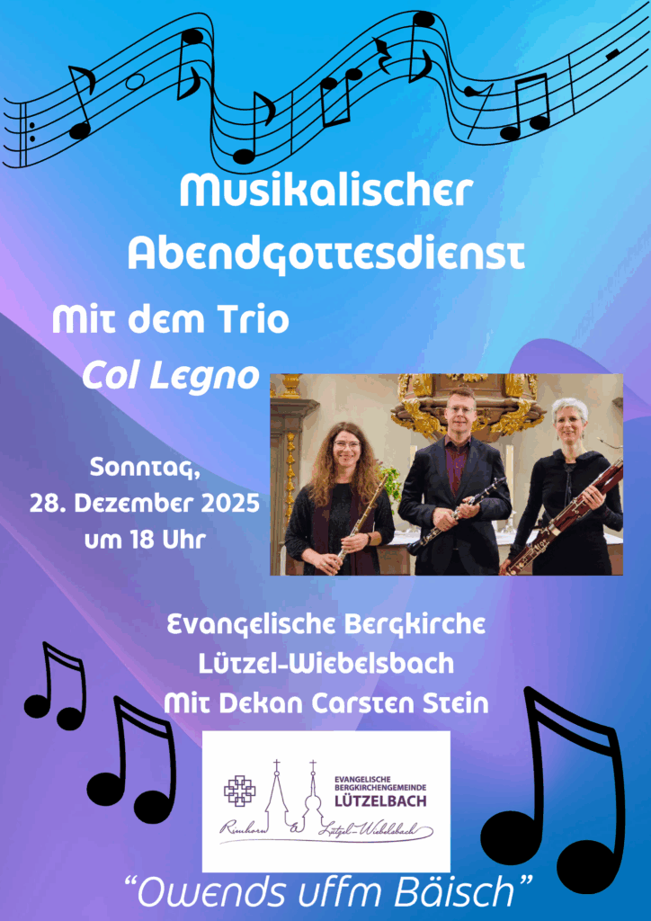 Sonntag, 28. Dezember, 1. Sonntag nach Christfest Wochenspruch: Johannes 1,14b 18:00 Uhr Musikalischer Abendgottesdienst in der Kirche Lützel-Wiebelsbach mit dem Trio Col Legno (Dekan Carsten Stein)